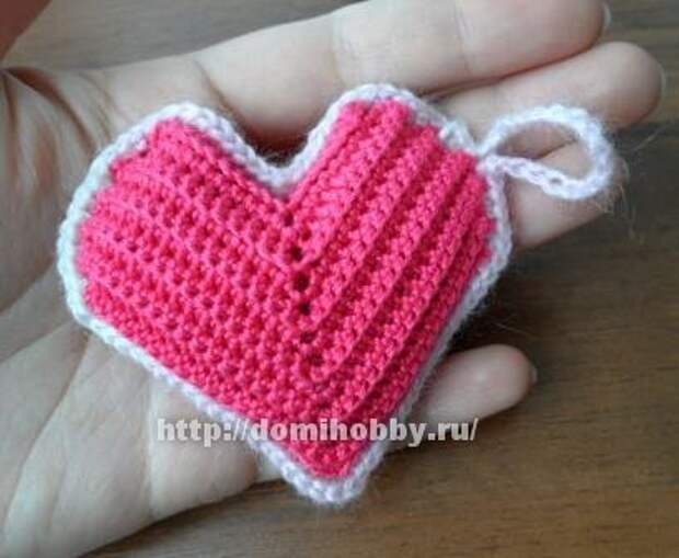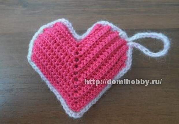 Два связанных сердечка соедините вместе и по краю обвяжите 1 рядом ст б/н нитью контрастного цвета. В любом месте сделайте петельку из цепочки воздушных петель.