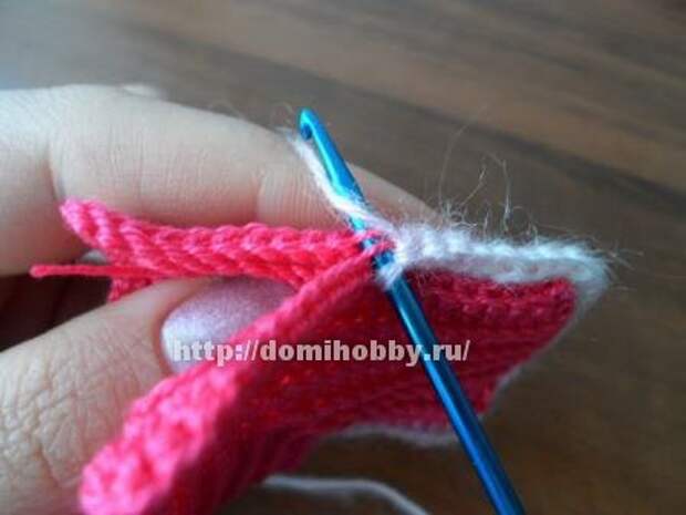 Когда останется небольшое отверстие, заполните сердечко наполнителем, лучше использовать любые остатки ниток розового или красного цвета, чтобы через дырочки не было видно цвета наполнителя.